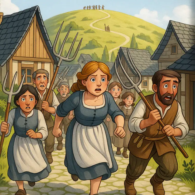 The villagers heard his cries and rushed up the hill. But at the top, there was no wolf… only Finn laughing at his trick.