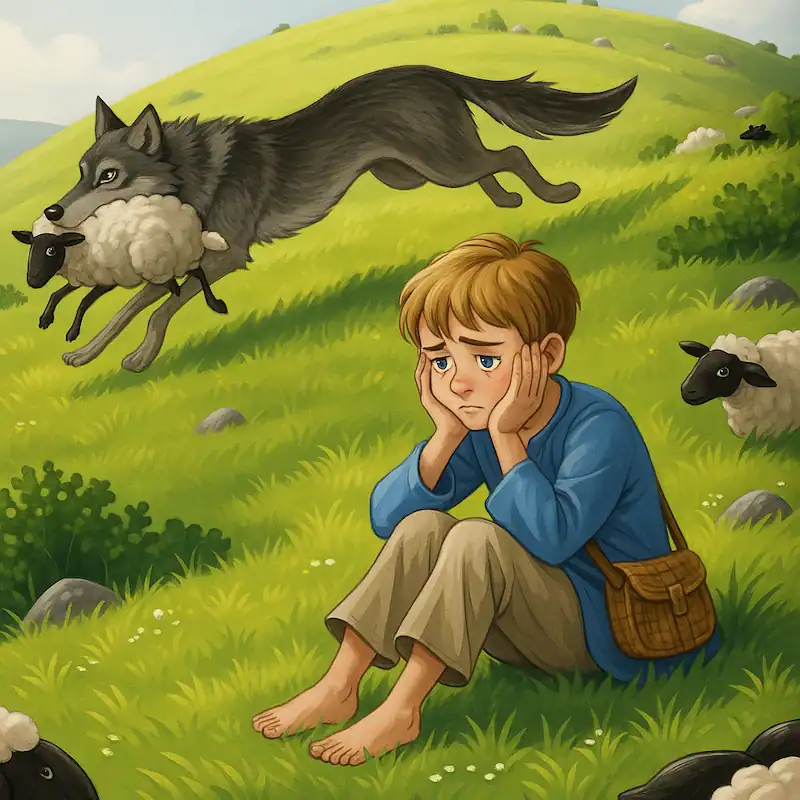 The wolf scattered the flock and carried one away. Finn was left alone, sad and regretful.
