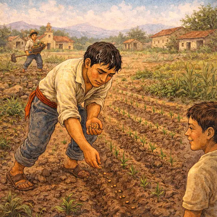 Among them lived a farmer named Tomás. He had good land. Everyone knew it. His field lay near the edge of the village where the soil was dark and rich. When rain fell, it soaked deep into the ground. A narrow ditch brought water close by. If someone had worked that field with steady hands, it could have grown tall maize, fat squash and enough beans to fill many jars.